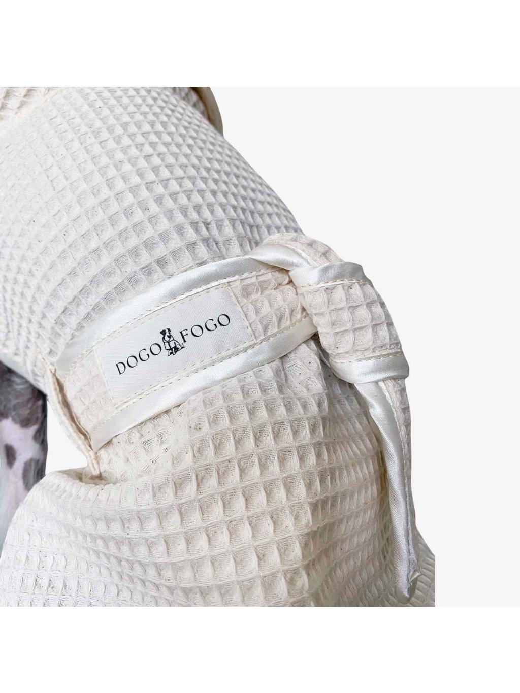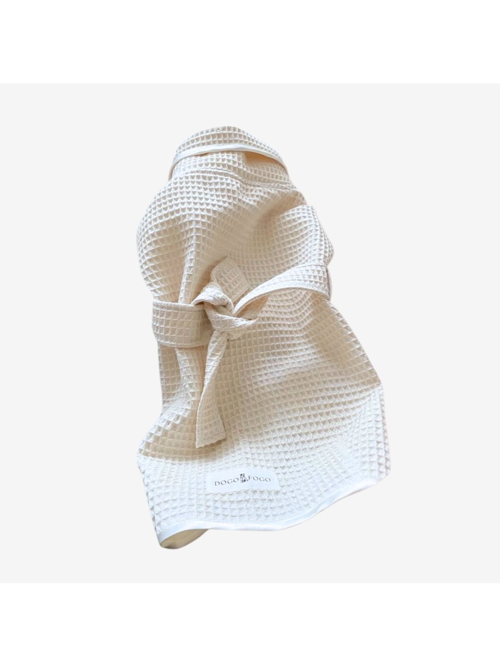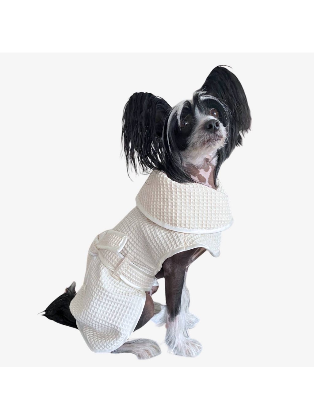 Otevřené bříško pomáhá vlhkosti rychleji se odpařit a dává pejskovi větší volnost. Zavazovací šňůrka kolem pasu župan podrží, ale nikde netlačí. Ohrnovací límec ochrání krk před chladem a dodá pocit jemného objetí.